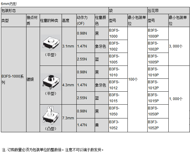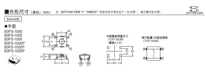 產(chǎn)品說明:B3FS 表面安裝輕觸開關 適用于高密度安裝的基板表面安裝型,備有6mm方形、壓花帶包裝型 ? 實現(xiàn)清晰的點擊感和高耐久性 ? 備有最適用于自動安裝的壓花帶包裝規(guī)格。 ? 凸型頂塊上可以安裝鍵頂(B32系列)