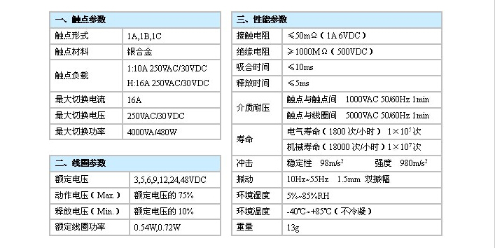 觸點(diǎn)容量:1:10A 250VAC/30VDC H:16A 250VAC/30VDC