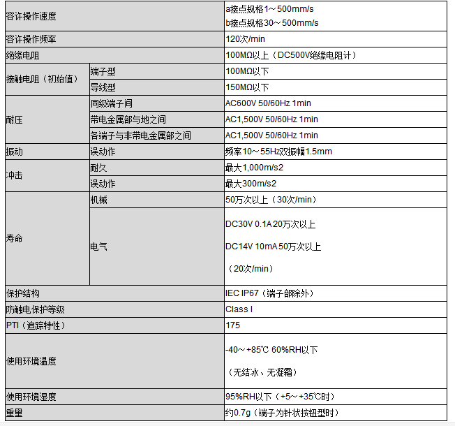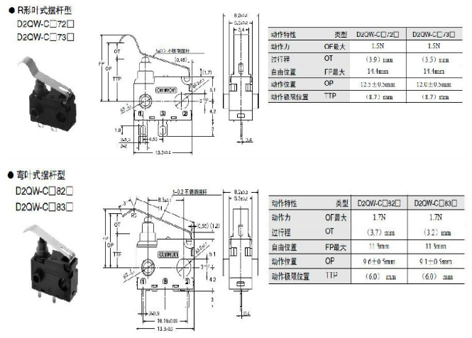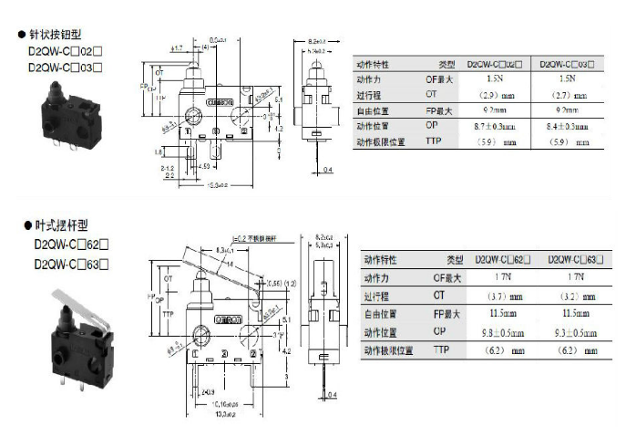 產品說明:D2QW 密封型極超小型基本開關 高可靠性和耐環境性兼備的長行程密封型開關 ? 無擺桿也能便捷使用的長行程規格。(OT參考值:2.7mm) ? 采用夾式接點的高可靠性滑動接觸機構。 ? 具備高溫耐久性(耐熱達+85℃)及防滴結構,可廣泛應用于耐環境性要求高的用途。(符合IP67:端子部除外) ? 備有高可靠性鍍金接點。