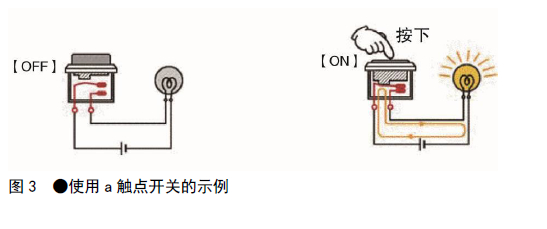 a觸點是指不操作開關時兩個觸點端子呈分離狀態(OFF),操作開關后則閉合(ON)的觸點。希望通過操作開關來啟動負載的情況下可以使用a觸點。上面圖1中介紹的電路就是使用a觸點的電路,未操作開關(按下)時燈不亮,操作開關后燈點亮(圖3)。